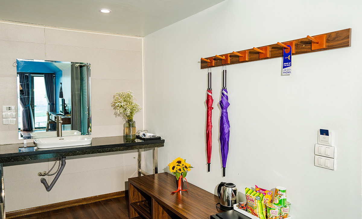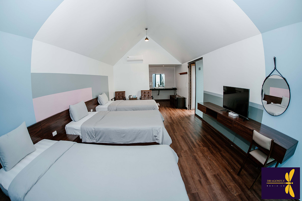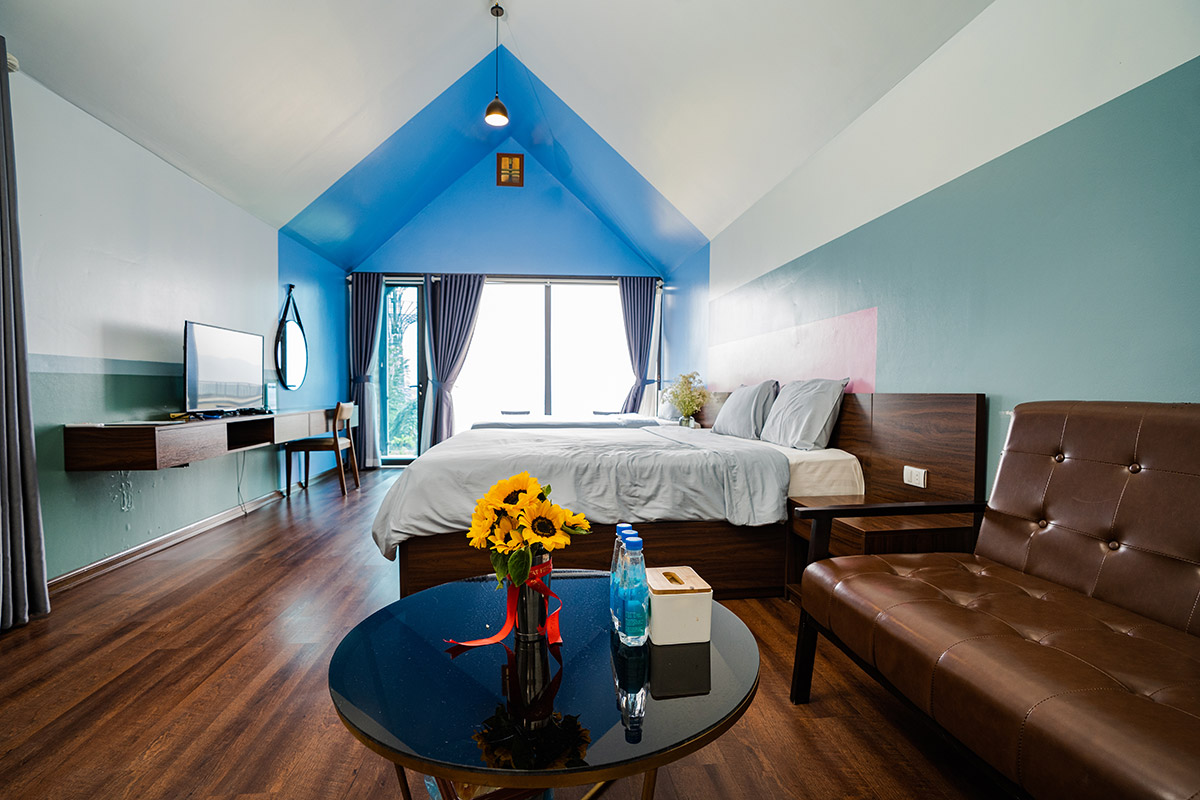 Information : A special room class designed in a unique European style, placed in the middle of trees, giving occupants a feeling of being in the middle of nature. The room consists of 2 separate floors with a maximum capacity of 5 people. The first floor includes: 1 double bed (standard 2 people) and the 2nd floor includes: 1 double bed + 1 single bed (standard 3 people). Using modern equipment, fully equipped with TV, refrigerator, 2-way air conditioner, hot and cold.... Suitable for family or group of friends, want to live together...